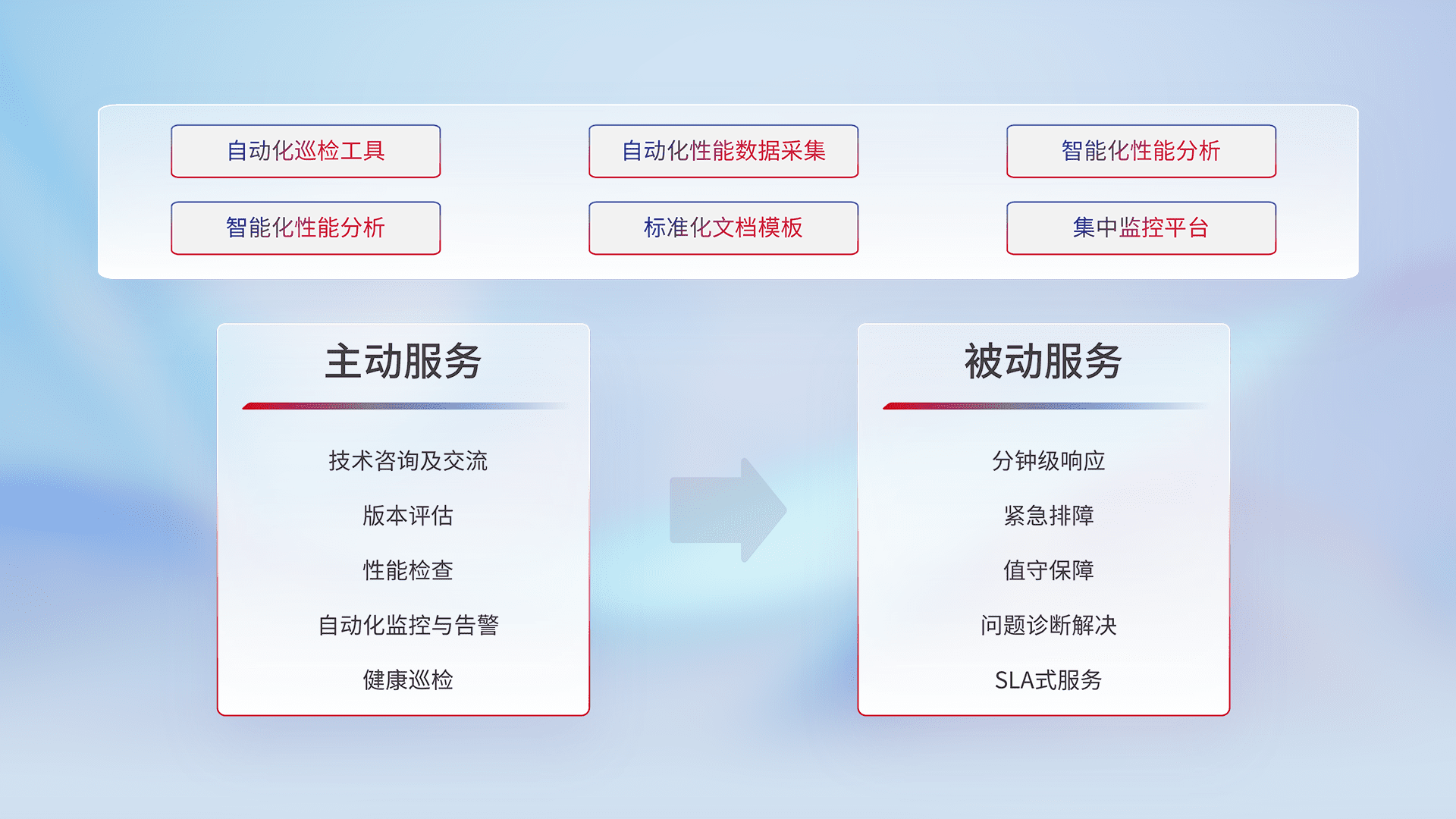 智能化工具和标准化文档,,,保障服务质量,,提供主动服务(包含技术咨询、、、、版本评估、、、、性能检查、、自动化监控与告警、、、、健康巡检)和被动服务包含(分钟级响应、、、紧急排障、、值守保障、、、、问题诊断解决、、、、SLA服务)。。。